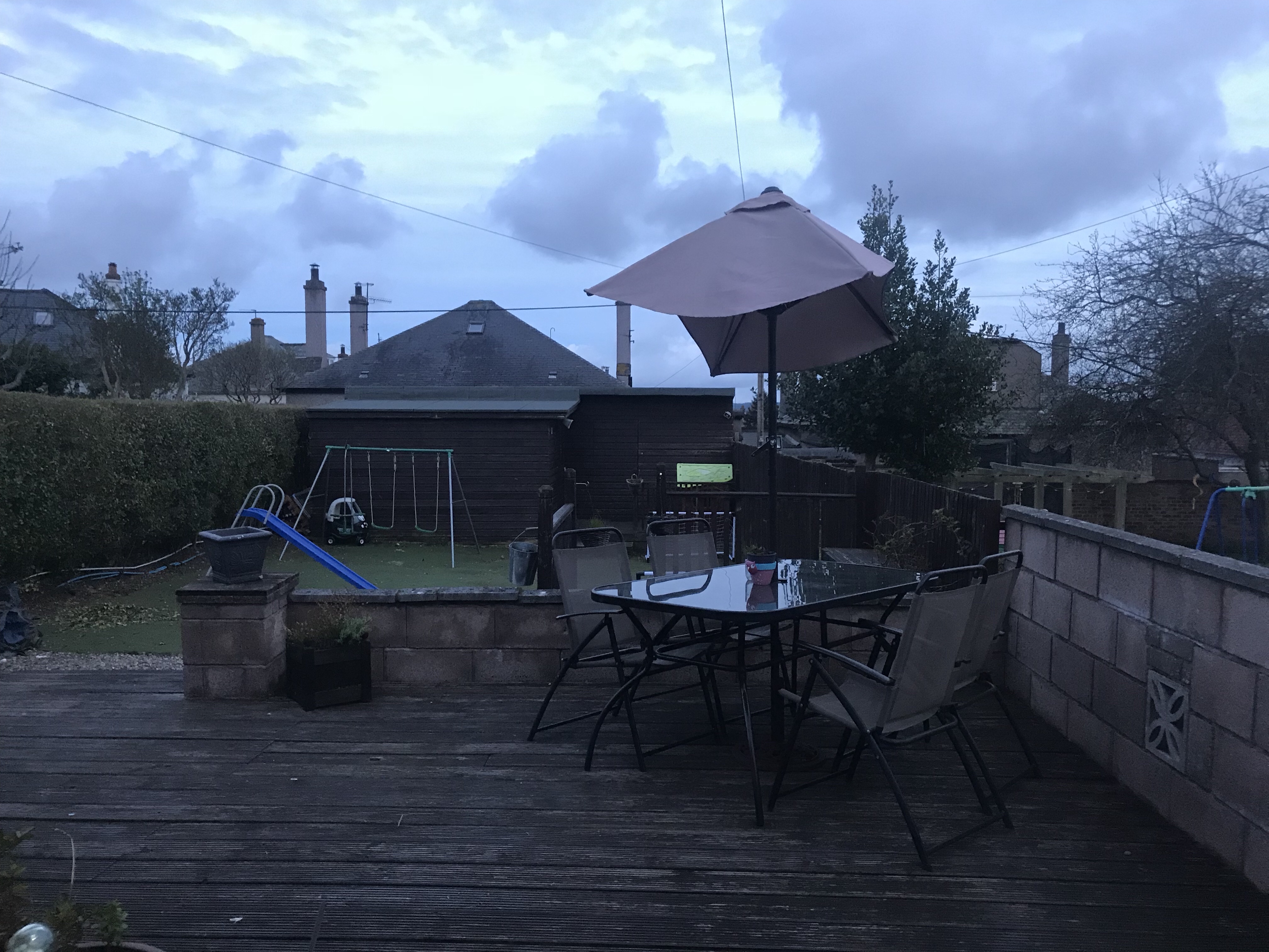 Over the summer we’ll get the decking repainted, clean up the AstroTurf, do borders and maybe replace the stones with bark.