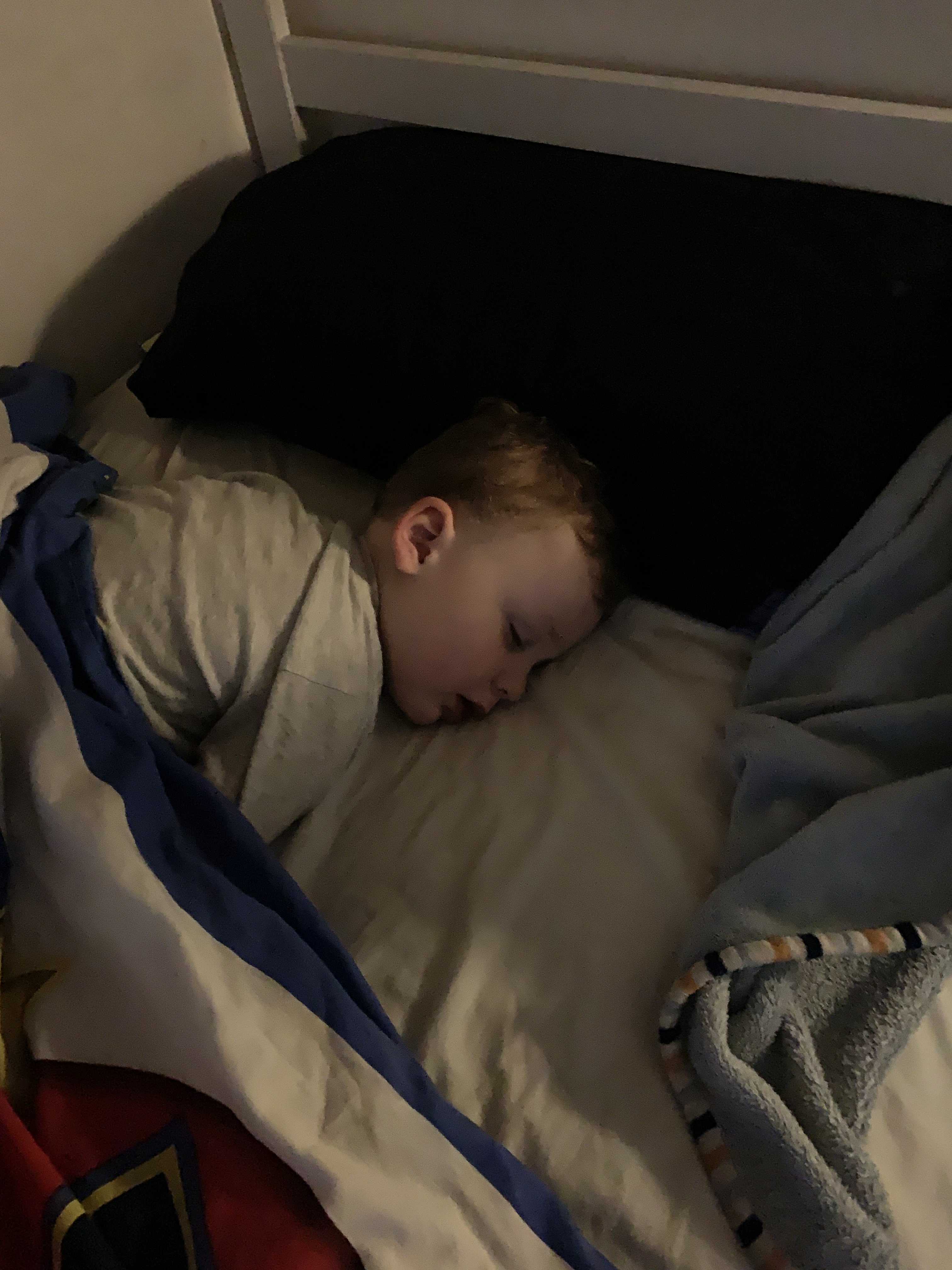 I guess the reflective thought process worked. I pulled the blankie out from under him and pulled up the covers. Stifling a snigger as he looked like he’d planked the bed.